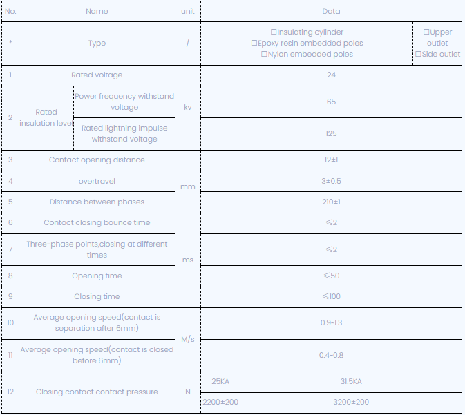 Le mécanisme de fonctionnement du bécher de circuit à vide de type à vide de type VBI-24 est utilisé pour l'énergie de stockage, qui peut être exploité de deux manières, manuel ou électrique. Les caractéristiques sont conformes à GB1984-89, JB3855-96<10kv Indoor High Voltage Vacuum Circuit Breaker General Technical Specifications>, Dispositions pertinentes de la norme IEC56.