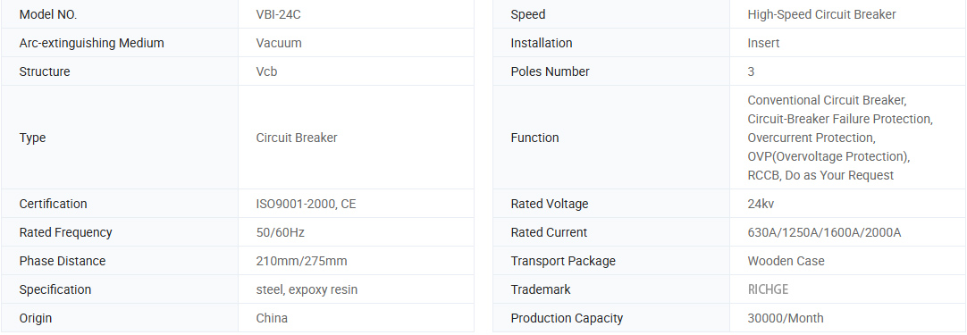 Le disjoncteur à vide VBI-24 à moyenne tension est une sorte d'équipement d'interrupteur à moyenne tension intérieur avec une tension nominale à AC 24KV de 50 Hz / 60Hz, qui a combiné la technologie de la société ABB en Suisse et s'est développée en Chine. Le produit est conforme aux GB1984 standard et IEC62271-100.
